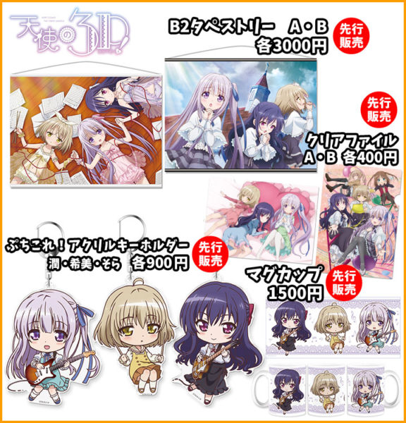 天使の3P!からは先行販売が盛り沢山!B2タペストリーやアクリルキーホルダーなどが販売されます。