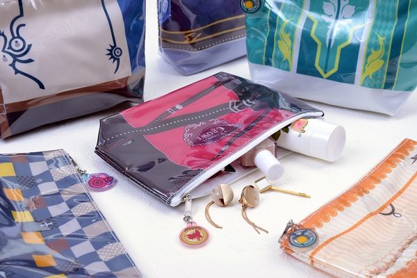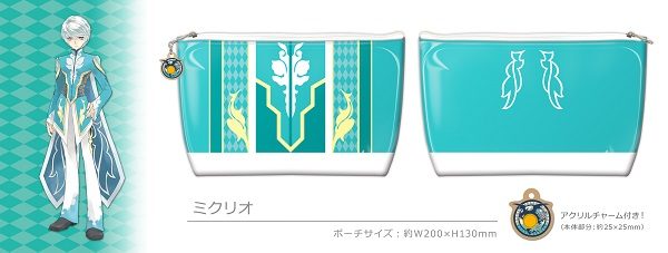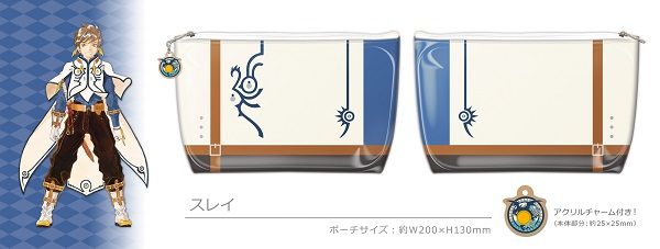 『テイルズ オブ』シリーズより、キャラクターイメージデザインをプリントした生地で縫製し、汚れから守るPVC製クリアビニールで包みこんだキュートなポーチ。タイトルモチーフのアクリルチャーム付きです。